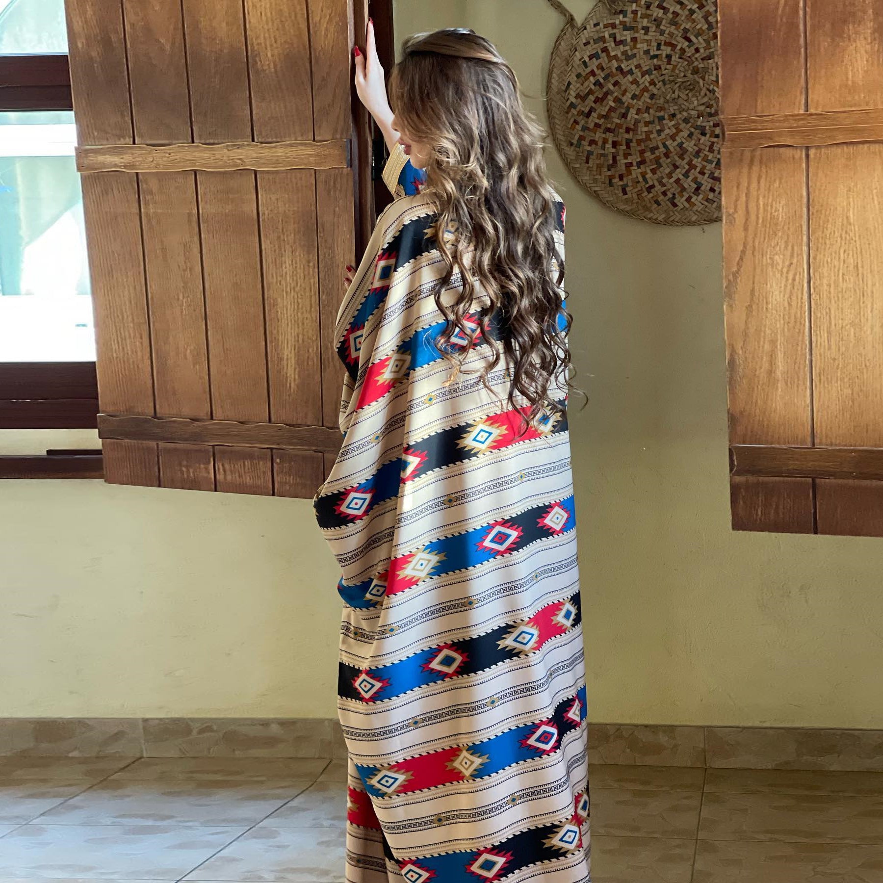 Add our new and exquisite Aztec blue duster coat featuring an intricate pale ivory trim to your evening ware wardrobe. Luxuriously crafted with timeless sophistication and effortless elegance, this special piece exudes a regal opulence, ensuring you make a grand entrance at any elegant soiree.