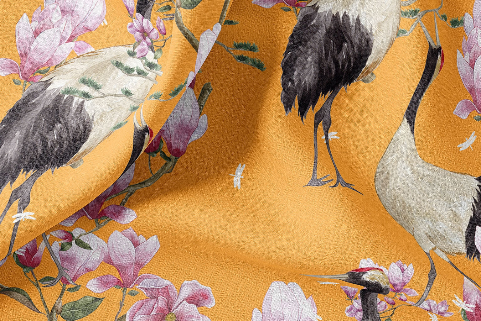 An orange as vivid as the sunset over Japan our beautifully classically designed cranes with pale pink blossom flowers are the epitome of Chinoiserie. This tablecloth is wonderful for more formal dinners or a sophisticated cocktail party at the height of summer.