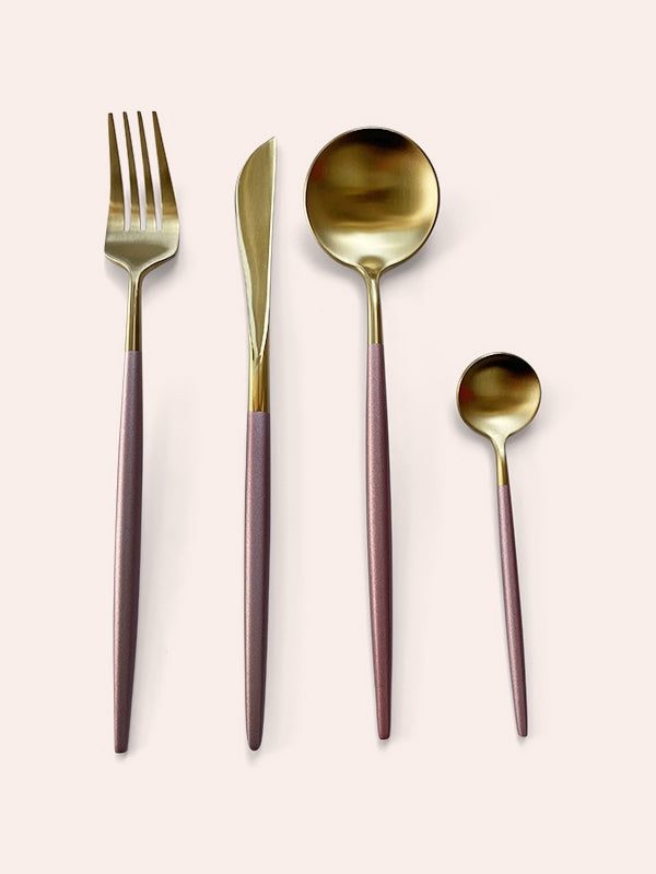 Pink and matte gold contemporary cutlery set of 4 pieces (dinner fork, dinner knife, soup/dessert spoon, tea spoon)